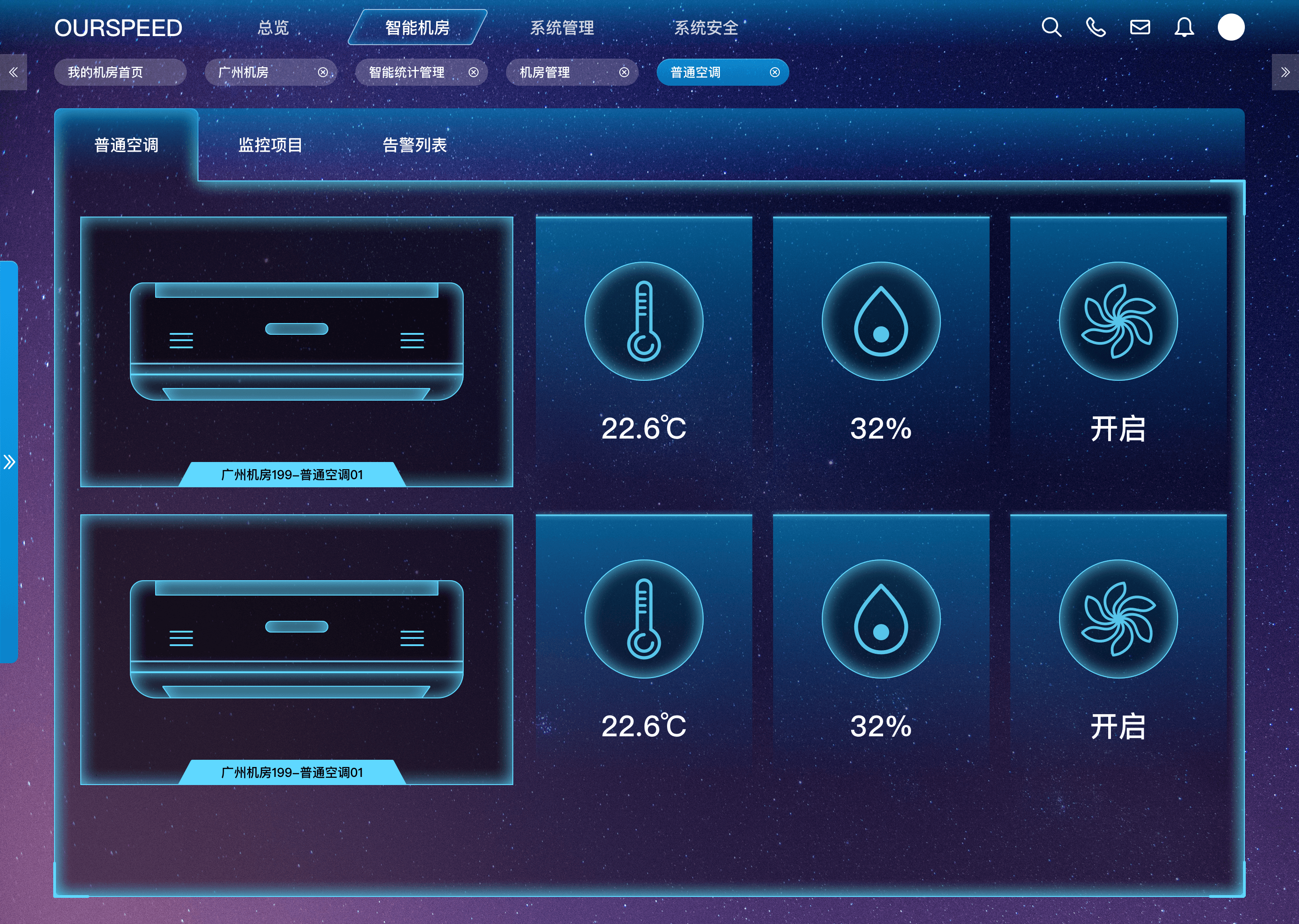 空調(diào)遠(yuǎn)程監(jiān)控:實(shí)時(shí)監(jiān)控倉(cāng)庫(kù)內(nèi)普通空調(diào)運(yùn)行狀態(tài),包括回風(fēng)溫度、送風(fēng)溫度、空調(diào)模式、開關(guān)機(jī)狀態(tài)、來(lái)電自啟動(dòng)等,確保倉(cāng)庫(kù)正常的溫濕度范圍,保證倉(cāng)庫(kù)存儲(chǔ)的物資在恒溫的環(huán)境下存放。