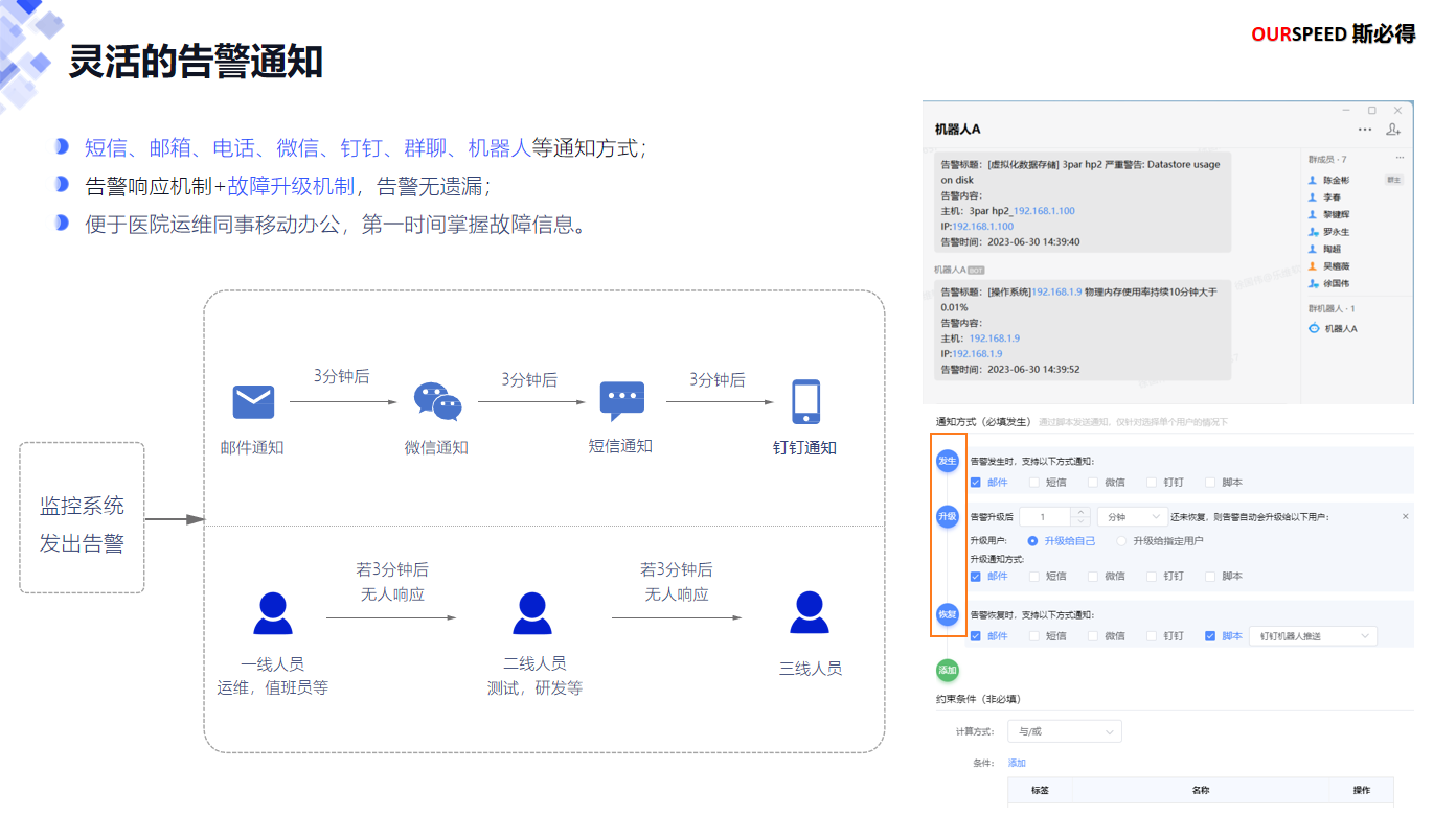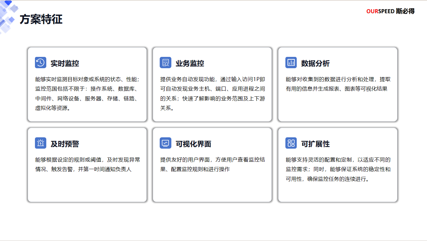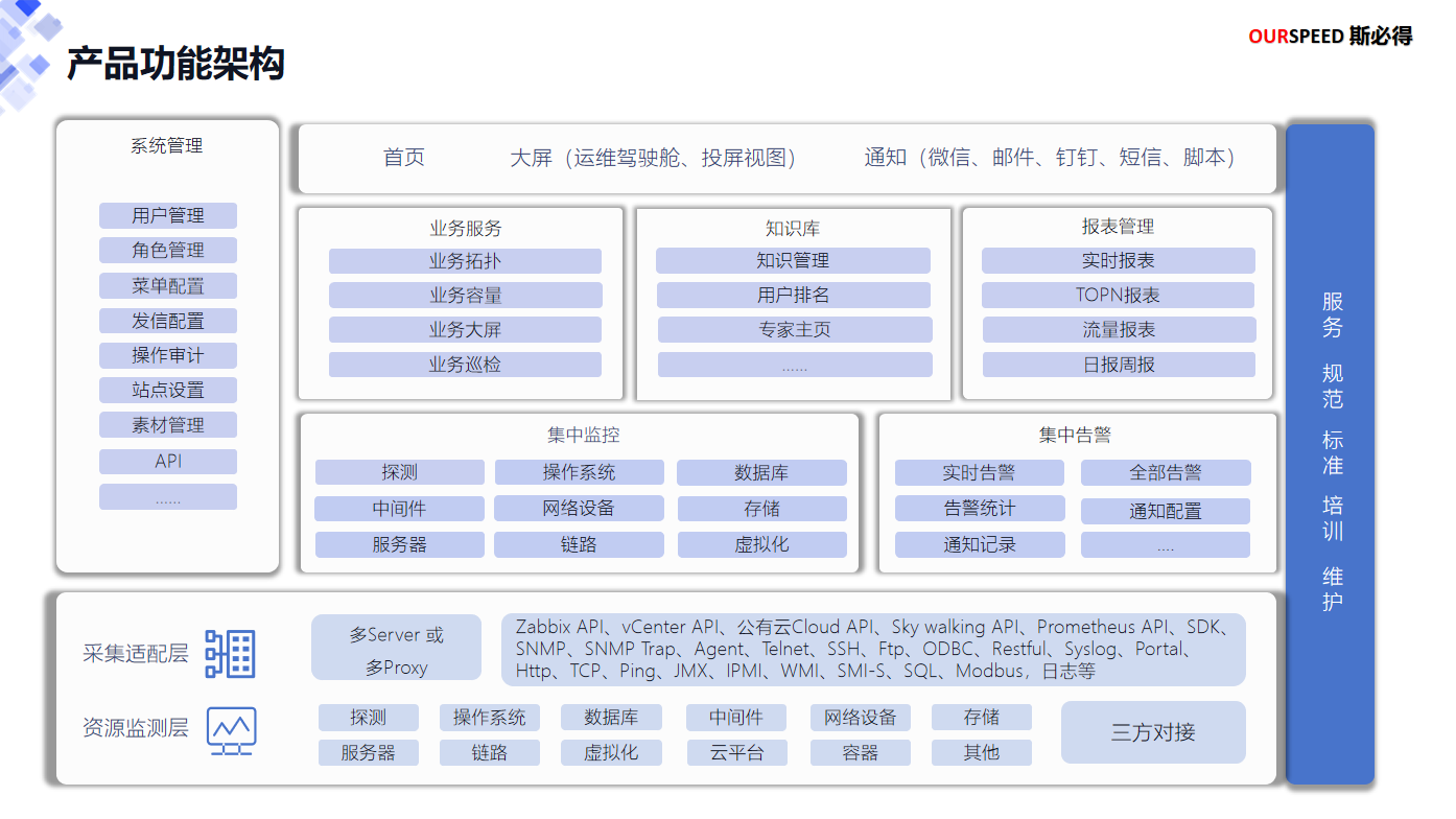 為更好的適應(yīng)高速業(yè)務(wù)發(fā)展,提高日常運維效率, 提供從IT基礎(chǔ)硬件設(shè)施、主機系統(tǒng)、小型機系統(tǒng)、網(wǎng)絡(luò)設(shè)備、機房環(huán)境、虛擬化、中間件、數(shù)據(jù)庫、攝像頭到業(yè)務(wù)可用性撥測的全鏈路一站式故障預(yù)警監(jiān)控、性能指標和管理平臺,能全面、快速、有效的反應(yīng)當(dāng)前IT基礎(chǔ)架構(gòu)和業(yè)務(wù)系統(tǒng)的健康狀態(tài),進一步降低業(yè)務(wù)宕機風(fēng)險,保障各業(yè)務(wù)支撐系統(tǒng)可靠、穩(wěn)定、高效地運行,進一步提高用戶的滿意度和忠誠度,全面提升服務(wù)質(zhì)量。
