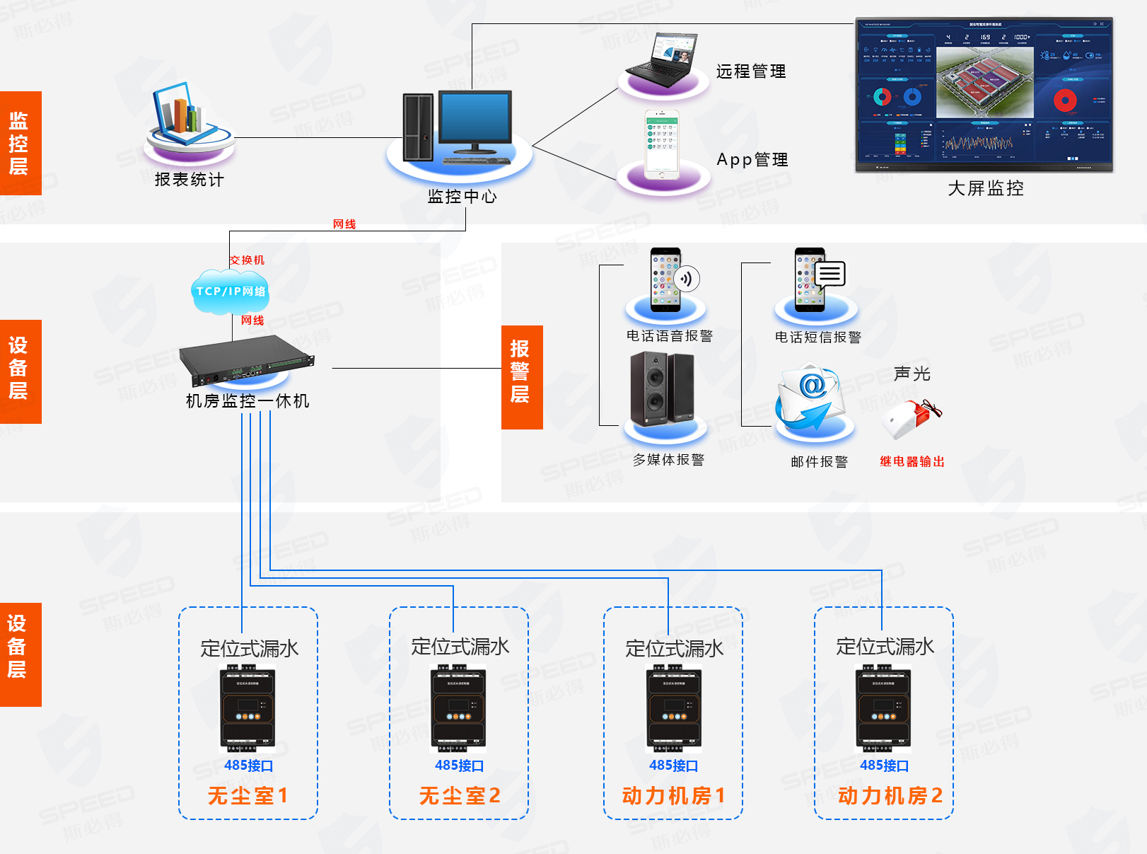 由于南方天氣雨水較多,導(dǎo)致部分機(jī)房及重點(diǎn)區(qū)域出現(xiàn)水浸現(xiàn)象,導(dǎo)致部分設(shè)備損壞,影響公司的正常運(yùn)營(yíng),因此要求對(duì)于現(xiàn)有的東莞分公司所涉及的動(dòng)力機(jī)房以及無(wú)塵室要求增加漏水監(jiān)控管理功能,且必須要能定位到區(qū)域,可遠(yuǎn)程實(shí)時(shí)監(jiān)控情況,漏水報(bào)警功能要求有電話、短信、APP等。
