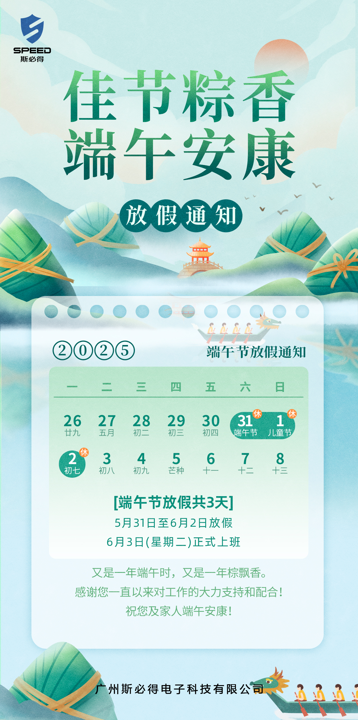 廣州斯必得2025年端午節(jié)放假安排,根據(jù)國務(wù)院辦公廳發(fā)布的《關(guān)于2025年部分節(jié)假日安排的通知》,今年端午節(jié)從5月31日(周六)至6月2日(周一)放假,一共3天。