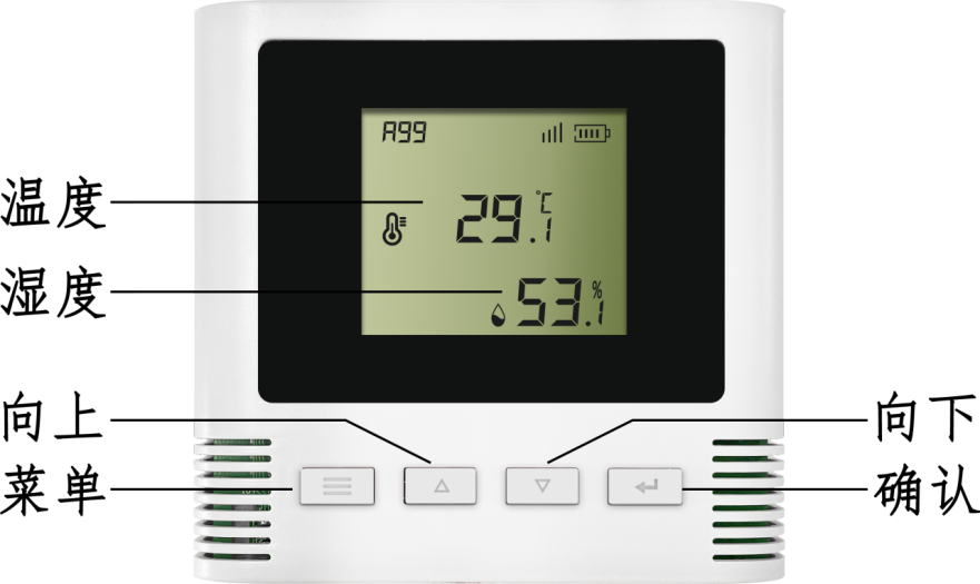 1. 主顯示界面為:溫度及濕度當(dāng)前值、SIM信號(hào)強(qiáng)度、電池電量信息。